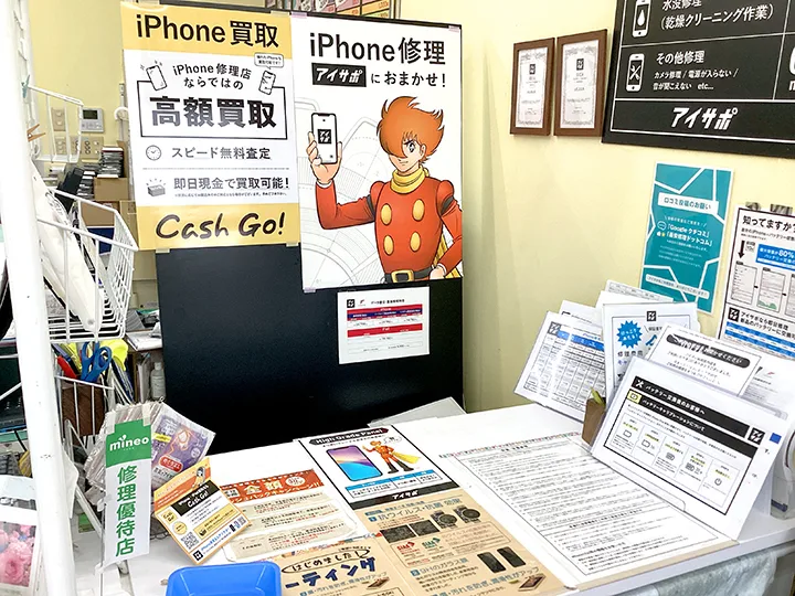 iPhone・iPad買取 Cash Go! 長岡宮内店は、iPhone修理アイサポ長岡宮内店内に併設されたiPhone・iPad買取専門店です。修理店ならではの技術と知識を活かし、画面割れや水没品などのジャンク品でも高額買取を実現。分割払い中の端末も買取対応しており、査定は完全無料です。県道370号線沿いにあり、無料駐車場も完備しているので車でのアクセスも便利です。